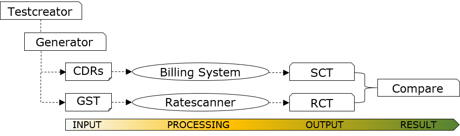end-to-end test scenario takes the combined potential of several modules inside the tools: after all input tables have been prepared, Generator will create the defined amount of CDRs suitable for test customer and environment. Once those generated CDRs are processed by the operator’s Billing System in test environment, rated events have to be extracted into the Source Check Table (SCT). Processing the Generated Source Table from the Generator by the Ratescanner will provide a Rated Check Table (RCT) as next output. Last testing step will be comparing the values between SCT and RCT data by an integrated compare function.